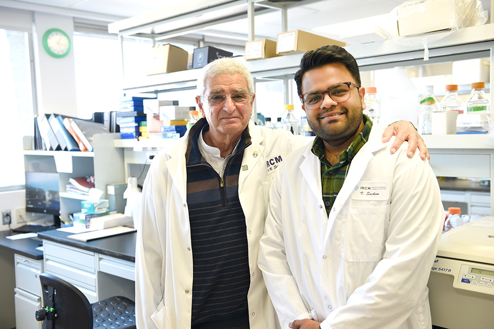 Dr Nabil Seidah et son doctorant Vatsal Sachan (Photographe : Hélène Lambin)